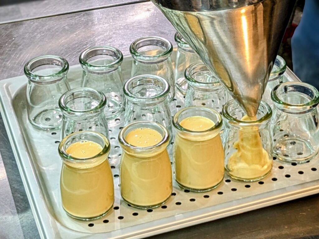 北海道産の牛乳と九州産の濃厚生クリーム、そして泉佐野・戸野養鶏場の卵黄と混ぜ合わせ、ていねいに蒸し上げます。